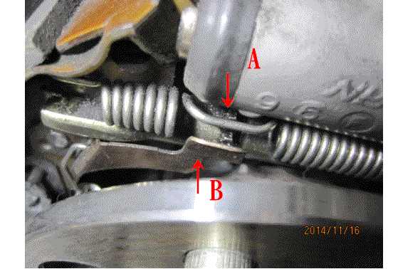 H26/11/16(87700Km):8年目のこの距離にして初めての調整です。 サイドブレーキの効きがかなり甘くなってますので思いつきました。 Pレンジで前輪に車止めを噛ませ、後部をジャッキアップしてタイヤを 浮かせ馬を噛ませます。タイヤを外すと写真のドラムブレーキが見えて きます。大概はドラムを手で引っ張れば外せますが、固着している場合は 対角線上の2個のネジ穴にボルトを入れて行けば外れます。ドラムを外すとブレーキシューが見えてきます。A=アジャストホイール、 B=アジャストレバー、この2つが自動調整機構の部分です。アジャスト ホイールの歯を写真下方向に(ー)ドライバーで回すと、ブレーキシューは 外に広がります。この作動は抵抗なくできますが、逆にシューを縮める 場合の上方向の回転は、アジャストレバーを手前に広げてロックを解除し ないと出来ません。アジャストレバーは指先で手前に引っ張れば可能です。 本来はこの操作が自動的に行われるわけですが、実際には各部の摺動 不良などにより充分行われない場合があるようです。従って2年に1度は ドラムを開けてこの調整を行う必要があるようです。私の場合は今年までの 8年間この調整はやらなかったのですが、左右のタイヤでシューの摩耗に 差が出ており、ブレーキの効きにも違いがありましたので、今回の調整と なりました。ライニングの残は4mm程で、摩耗限界は1mmですから今回 はシューの交換は行いません。