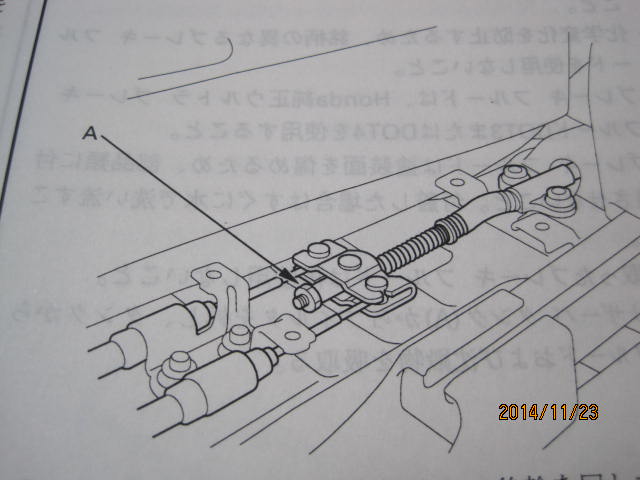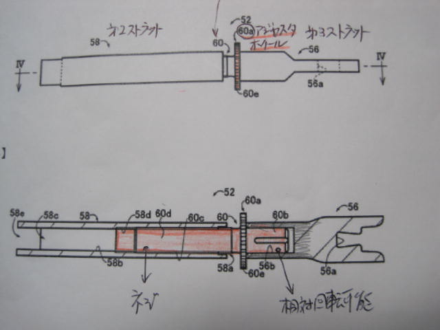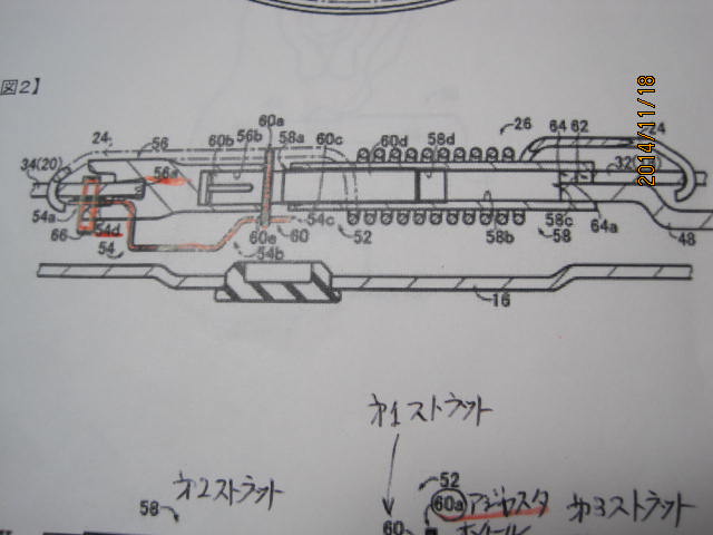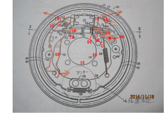 @ブレーキ非制動時 アジャストレバー54は、アジャストスプリング68によって軸部材66回り 矢印G方向に回ろうとするが、54dがコネクティングロッド56の凹部で止め られていることによって、軸部材66回りの回転が抑止される。また、リターン スプリング24の力はアジャストスプリング68の力より大きいため、スプリング 68の力によってアジャストレバーがコネクティングロッドをブレーキシュー18 側へ移動させようとしても、一対のブレーキシュー18,20は開く方向には 移動しない。 @ブレーキ操作時 ブレーシュー18,20が開くと、アジャストレバー54と接する部分54dは スプリング68の力によってコネクティングロッドの58部分をブレーキシュー 18側に移動させる。ブレーキ制動時において一対のブレーキシュー18,20 の開く量と、コネクティングロッド56とブレーキシュー20との隙間は概略同じ となり、一対のブレーキシュー18,20の開く量に応じてアジャストレバー54 は54d部がコネクティングロッド56と当たって止められるまで、軸部材66回り 矢印G方向に回転する。 @サイドブレーキ操作時 パーキングブレーキケーブルを介してパーキングブレーキレバー48がバッキング プレート16の中心側へ移動させられると、ブレーキシュー20がコネクティング ロッドに押されて外周側へ移動させられるとともに、ブレーキシュー18がピン 50に押されて外周側へ移動させられるので、一対のブレーキシュー18,20 が外側に開かれて制動力が発生する。サイドブレーキ操作はシュー間隙 自動調節とは無関係である。サイドブレーキの調整方法は、ブレーキを開放 したとき後輪がスムースに回転し、ブレーキを1ノッチ操作したとき後輪が軽く 引きずって回ることとなってます。 @自動調整:ペダルON ブレーキ操作によってブレーキシューが開かれ制動力が発生する。ブレーキ ペダル操作が繰返し行われてライニングが摩耗しシュー間隙が大きくなると、 ホイールシリンダーにより一対のブレーキシュー18,20が開かれることに よって、アジャストレバー54の軸部材66回りの回転に連動してアジャスト ホイール60の歯と噛み合い、ライニングの摩耗量によってアジャストホイール が回転させられる。それにより、コネクティングロッドが伸びてシュー間隙が 調節される。 @自動調整;ペダルOFF ブレーキペダル操作解除時には、リターンスプリングの力によってブレーキ シュー20とロッド56の先端部とが接するまでコネクティングロッドがブレーキ シュー20側へ移動させられるのに伴い、アジャストレバー54はスプリング68 の力に抗して矢印G方向と反対方向に回転させられる。又、ブレーキペダル 操作解除時のアジャストレバー54の戻り回動時には、アジャストホイール 軸部の摩擦による回転抵抗によってアジャストホイール60の戻り回転が阻止 され、平板状のレバーがホイールの歯を乗り越えるようになっている。 @サイドブレーキ調整 ・ パーキングブレーキペダルを1ノッチ踏む ・ フロア中央のカーペットをめくり、ボルト4本を外しパーキングブレーキ イコライザカバーを取り外す。 ・ 写真のアジャストナットを後輪が軽く引っ掛かって回るところまで締め込む。 ・ パーキングブレーキを解除し、後輪を回して引きずりがないことを確認する。 ・ パーキングブレーキペダルの踏み代は5から7ノッチである。